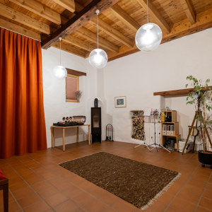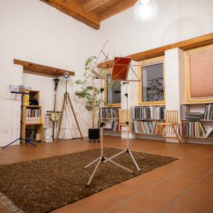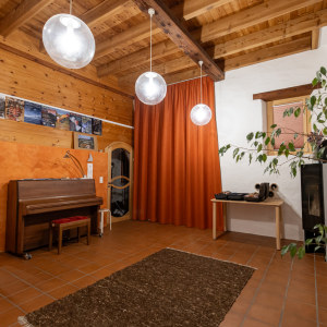 Der "salotto" hat eine besondere Atmosphäre, auch seiner Geschichte wegen: Die eindrucksvolle Höhe von 3.5 Metern verdankt er der ursprünglichen Nutzung als Maschinenraum, die Behaglichkeit der späteren Verwendung als Wohnzimmer, und nun darf er seine gute Akustik als kleiner Musik - und Kultursalon ausleben.